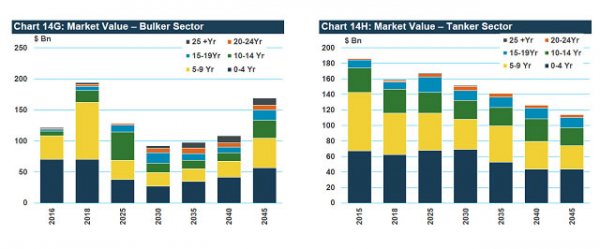 整体而言,2018年至2030年,全球干散货船的价值将从1950亿美元下降至900亿美元。
