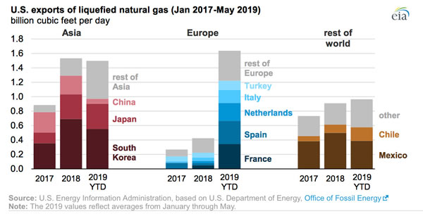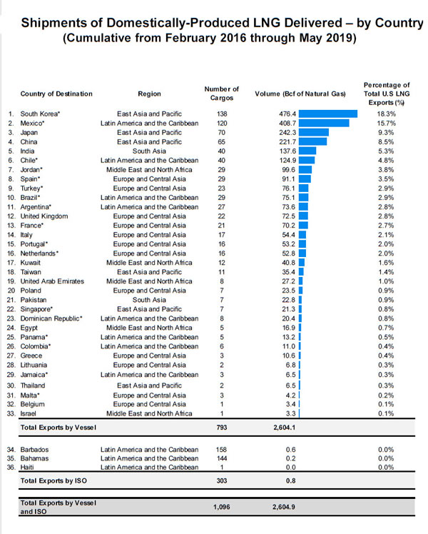 美国自从2016年2月起出口液化天然气(LNG),到2019年5月共出口793船LNG,2604.1BCF(737.4亿立方米),其中中国是排在第4位的进口国(在韩国、墨西哥、日本之后),这期间共进口65船,共221.7BCF(62.8亿立方米),占美国LNG出口总量的8.5%。2018年9月中国对美国LNG加税10%,此后进口量大幅度下降。