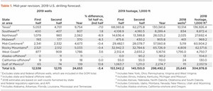 Overall forecast. Against this backdrop, World Oil forecasts a slight drilling slowdown for the remainder of the year, projecting 24,653 total wells for 2019—a 3.4% reduction from the 2018 count of 25,645, Table 1. Total footage is projected to decline from 304.9 MMft in 2018 to 298.5 MMft in 2019—a decrease of 2.1%. During 2019, 12,538 wells are estimated to have been drilled during the first six months, while 12,115 are expected to spud in the second half of the year, for a half-to-half decline of 3.4%. A 5.3% decrease in footage is expected in the last six months.