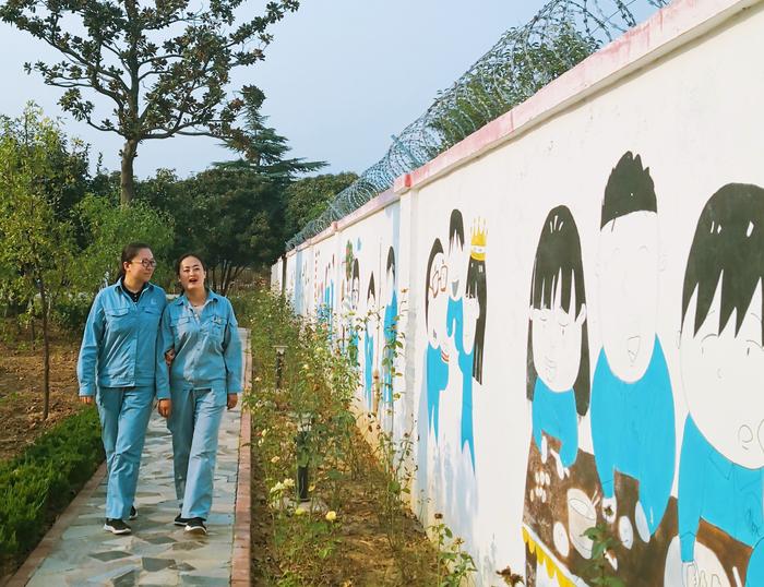 图为滕州站职工在文化墙前散步。