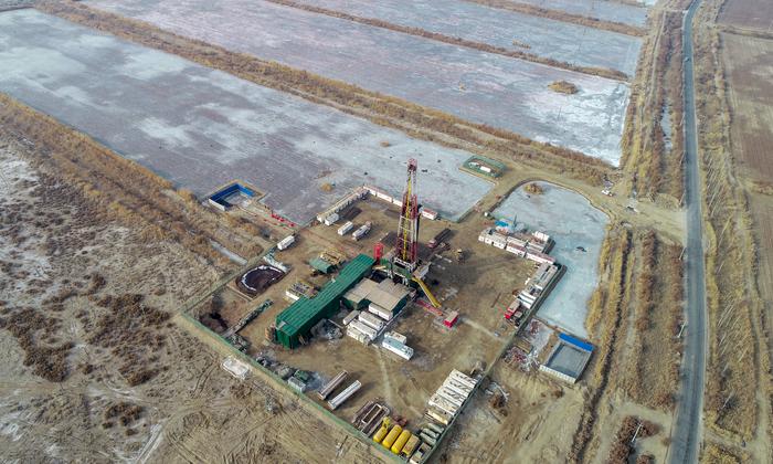 1月1日,塔克拉玛干沙漠北缘的塔河油区零下15度,西北油田采油三厂TH10444H井正在钻进,施工人员瞄准新年产量目标,精心组织施工,确保该井增产提效。 2020年,该厂以问题和需求为导向,计划实施注水145口井次、注气78井次、措施110井次,全力以赴完成120万吨原油产量任务。 图为TH10444H井施工场景。