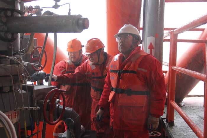 1月7日,KD481平台干部员工正在冒风巡检平台设施。针对近日海上风雪天气,胜利油田海上油区各平台积极落实各项应对措施。各平台认真排查海管海缆、工艺流程等关键要害部门和薄弱环节隐患,检查固定室外设施,详细落实铁丝、吸油毡等应急抢险物资和住人平台生活物资储备情况,积极应对可能产生的各类问题,尽量降低恶劣天气造成的损失。