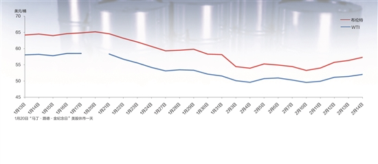 近两个月来,国际油价持续震荡。1月6日,受地缘局势恶化以及贸易前景向好推动,国际石油市场走强,布伦特原油价格一度突破70美元/桶。而2月4日,国际原油市场对需求的忧虑超过了“欧佩克+”加大减产的希望,布伦特原油跌破54美元/桶,跌至一年多来的最低水平,较1月初的高位跌幅超过20%,WTI价格更是降至49.61美元/桶。然而,受到中国新增冠状病毒感染病例的减少、减产联盟进一步减产的预期升温的影响,2月10~14日,WTI原油期货价格从49.57美元/桶上涨至52.05美元/桶,布伦特原油期货价格从53.27美元/桶升至57.32美元/桶。