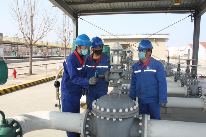 图为该油库接卸班员工在工作现场探讨优化卸油工艺流程。
