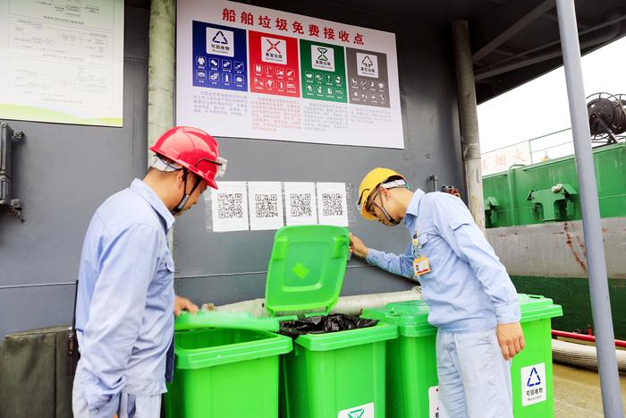 7月6日,巴陵石化储运部道仁矶装置趸船上的船舶垃圾接收点,管理人员查看靠港外来承运商船舶生活垃圾接收投放情况。 为落实船舶与港口污染物防治相关要求,促进长江生态保护,道仁矶储运装置根据海事部门承诺、公告、流程、协议、记录“五到位”要求,进行工艺改造,明确生活垃圾和污水接收流程,将生活垃圾回收桶按分类布置为可回收物、有害垃圾、易腐垃圾、其它垃圾四种,每个桶盖上方都贴有二维码,船方只需扫描二维码,就可在手机上进行船舶垃圾接收申请,获批准后再将生活垃圾投入对应的回收桶,再通过垃圾车进行转运。此举解决了船舶生活垃圾等接收处置问题,船岸双方严格按要求落实船舶垃圾接收和处置工作,为打造绿色码头贡献力量。