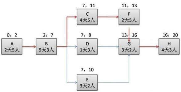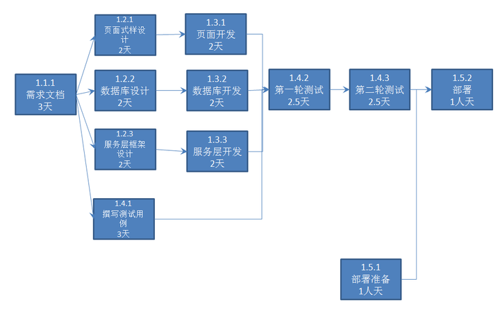 方块内为任务,以及需要的工时,连线标明任务的关系。