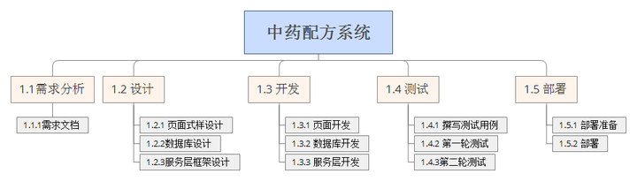 拿软件开发举个例子,对于一个完整的项目,会有如下的工作分解结构: