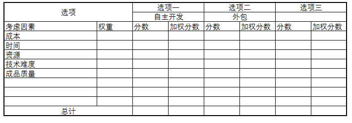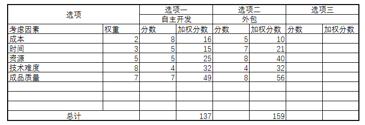 小伟罗列了成本,时间,资源,技术难度,成品质量五个考虑因素。并将此表格发送给了,技术经理,上级主管,财务主管,再加上小伟自己。