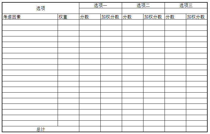 下面是一张决策评估表,在此只是做一个抛砖引玉的作用,具体项目可以根据不同的要求做修改。