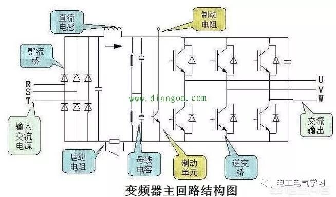 这是变频器的主回路电路结构图,可以看出,它输入一般是三相交流380伏电压(有些单相的输入时220伏),通过整流桥把三相交流380伏电压整流变成530伏左右的直流电压,经过简单滤波和电容稳压以后,利用6个IGBT之类的开关管,通过PWM斩波的形式,逆变成频率和电压可以调整的三相交流电源输出,UVW就是电机的三相端子,根据电机控制上的理论,异步电机的转速和电源频率成正比例关系,所以调整频率就可以调整电机转速了,但是如果频率变化而电压不变,会要求气隙磁通过大,引起磁路饱和,容易烧电机,所以需要让V/F(电压和频率比值)是一个恒定值,而保持一定的V/F(电压和频率比值),能让电机工作在恒扭矩的工作状态。