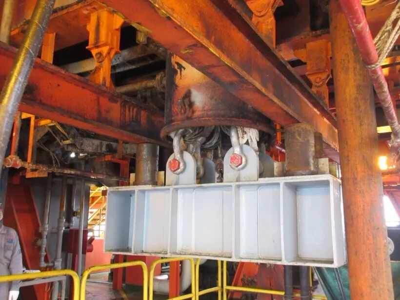 实施手段创新。按照SY 6326-2012规范要求,井架的承载能力测试所用载荷应不小于设计最大钩载的25%,海洋石油钻修井机的设计最大钩载通常在250~650吨,所需测试载荷高达65~165吨,测试载荷的来源是井架承载能力检测所面临的一大难题。如果将钻柱悬重作为测试载荷,则必须在钻井作业期间实施承载能力试验,还必须进行特殊的井身设计,以获得稳定不变的提升钩载,这必然会对追求高时效的钻井作业带来巨大的负面影响;如果采用试重水袋或试重块作为测试载荷,重物的运输和施工过程将会花费庞大的经济成本和时间成本。为此,CCSI设计并定制了一件最大承载能力为175吨的试验工装,用钻修井机的提升系统将试验工装卡在钻台主结构梁的底部,通过提升系统的可控提升来实现对井架的加载。这种创新的加载方式简便可控,极大地降低了测试成本,时效最高,同时又可重复使用,并适用于不同承载能力的各种井架,实现了多方共赢。